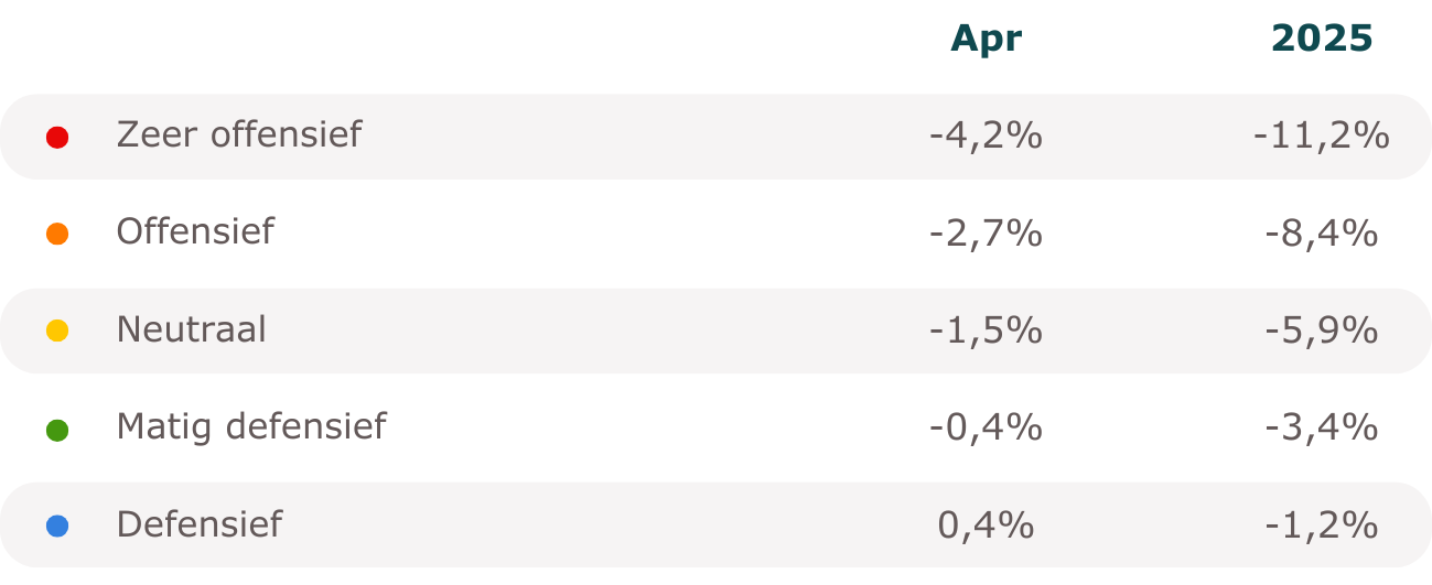 April was opnieuw een slechte beursmaand, waarbij vooral Trumps ‘Liberation Day’ veel kwaad bloed zette bij beleggers. De beurs was zeer beweeglijk, waarbij negatieve en positieve dagen elkaar afwisselden. Aandelen verloren zo’n 4% en obligaties stegen met 1%.