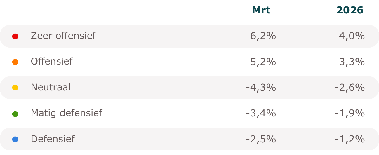 Na een zeer positief eerste kwartaal, gingen de koersen in april iets omlaag. Het rendement voor 2024 komt uit op 6,6% voor de meest offensieve beleggers en op 0,8% voor de meest defensieve beleggers.Lees meer -