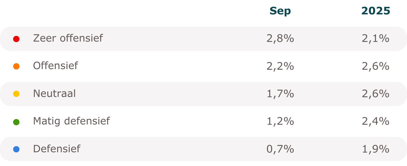 In september vervolgden aandelen onverstoorbaar de weg omhoog. Alle profielen staan dit jaar op een plus van zo’n 2 tot 2,5%. Dat was op 7 april wel anders. Toen Donald Trump dreigde met extra importheffingen, stonden aandelen nog op -17%. Het kan dus verkeren.
